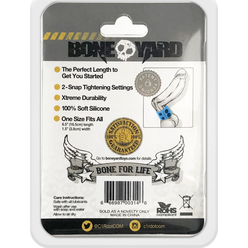 These must-have man toys are designed with superior materials and production thus increasing both comfort and lifespan. The powerful and iconic Boneyard-branded design has a sleek soft touch silicone finish and features a superior and durable stretch. The medical grade 100% silicone snap ball stretchers come with 3 snaps on one end and 1 on the other giving the wearer 3 sizing options to find the correct size.